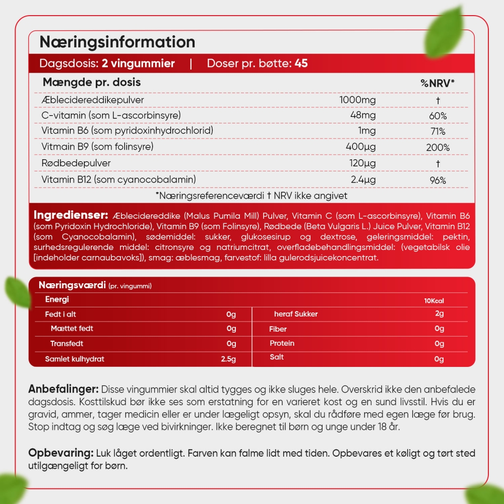 Med vores vingummitilskud får du hele 1000 mg æblecidereddike pr. dagsdosis. Tilskuddet er ligeledes beriget med vitaminerne B6, B9, B12 og C, som blandt andet bidrager til: