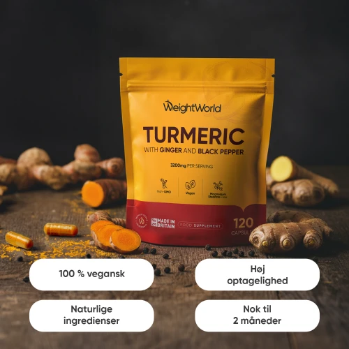 Vores gurkemeje-kapsler med ingefær og sort peber er et 100% vegansk gurkemejetilskud.