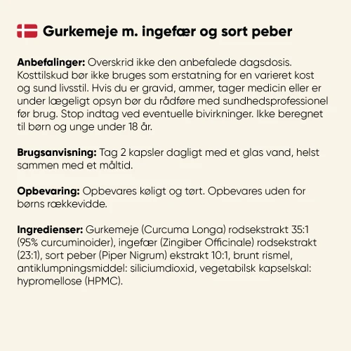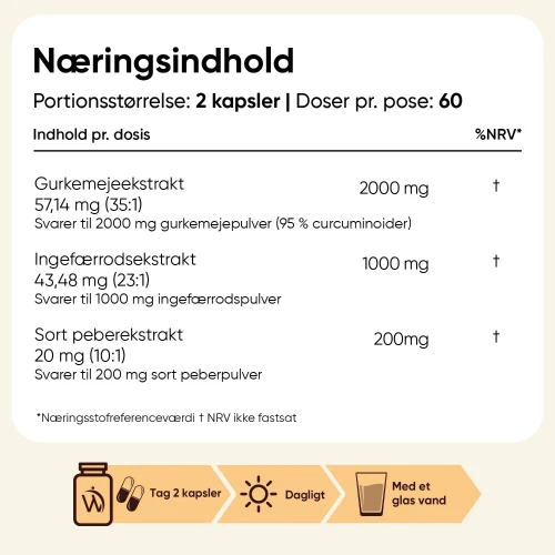 En dagsdosis indeholder 2000mg gurkemejeekstrakt, 1000mg ingefærrodekstrakt og 200mg sort peberekstrakt.