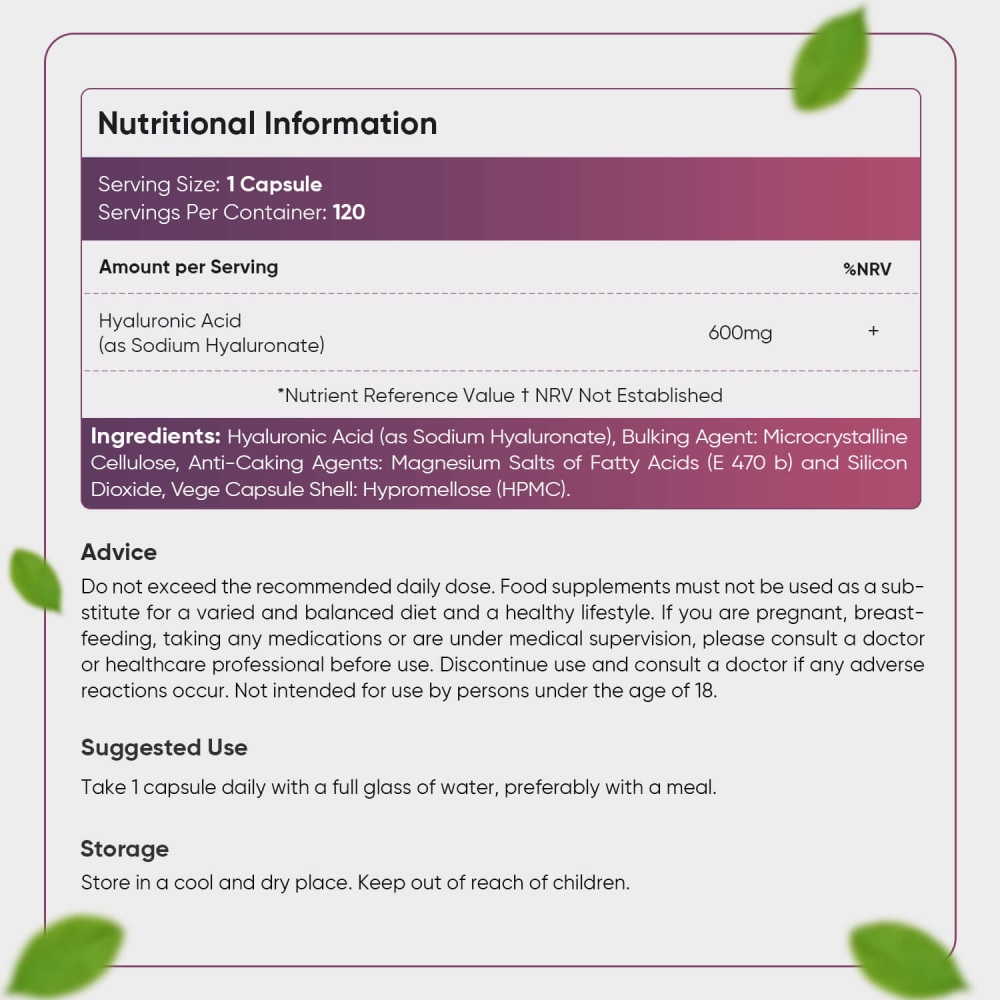 Hver kapsel giver dig en høj daglig dosis på hele 600mg hyaluronsyre, er lavet af ingredienser af høj kvalitet, og er 100% vegansk.