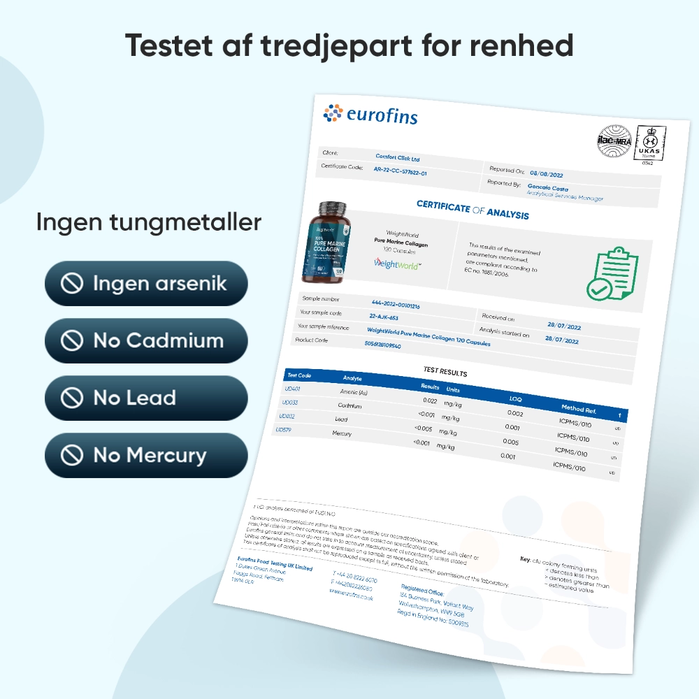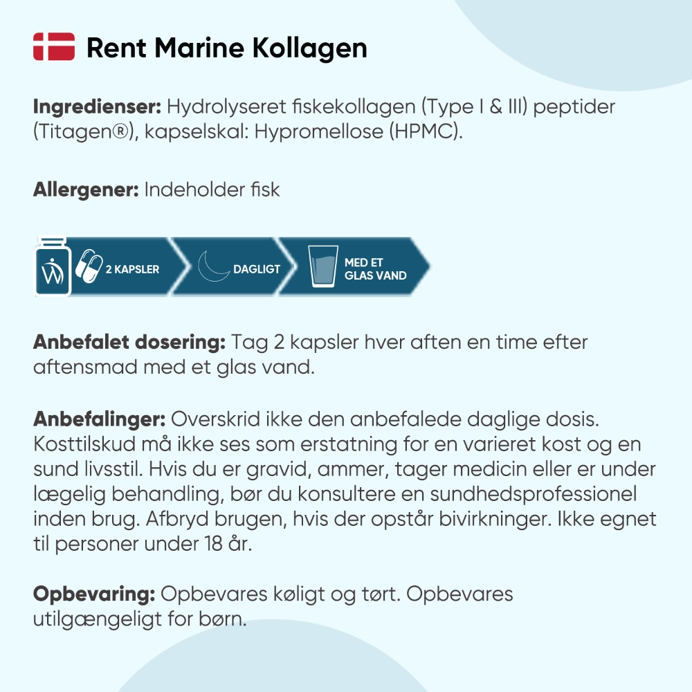Når vi når omkring 35-årsalderen begynder vores krop at forbruge mere kollagen, end den selv kan producere. Dette kan resultere i rynker, knirkende led og andre problemer. Derfor har WeightWorld udviklet kollagenpiller med et højt indhold på hele 1200 mg hydrolyseret Titagen® Marine Collagen pr. daglig dosis. Dette giver dig de bedste betingelser for at få et naturligt boost af kollagen.