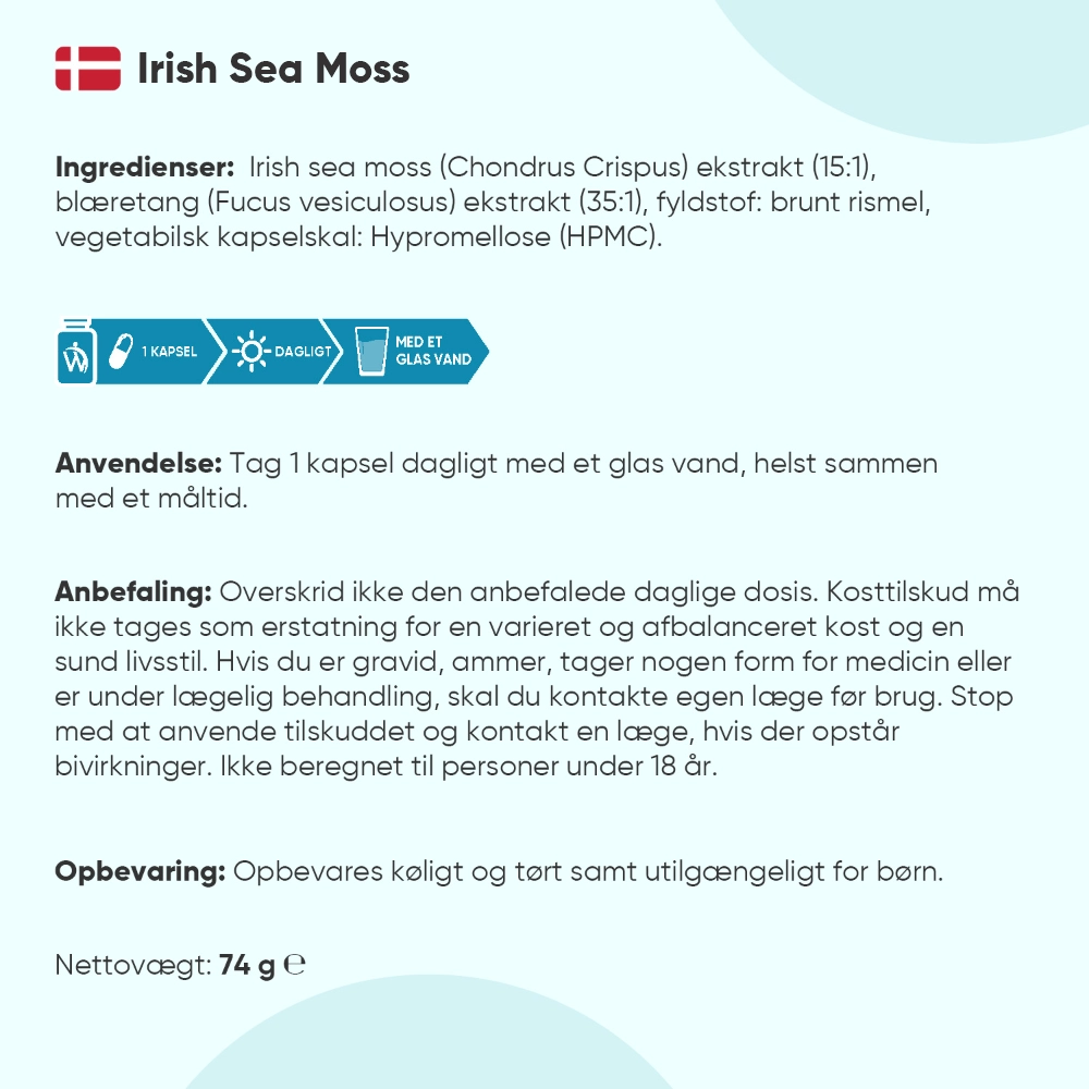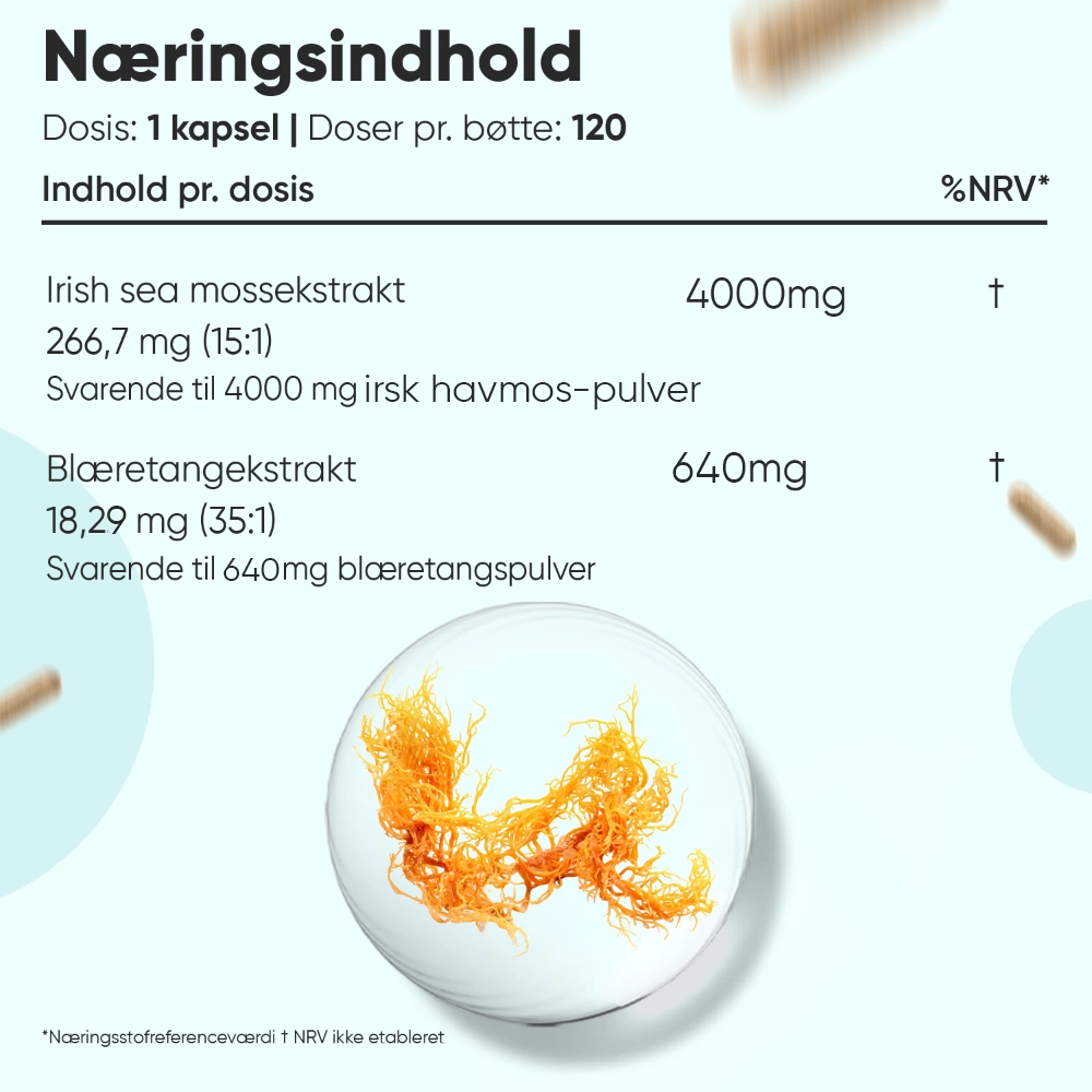 Irish sea moss-kapsler med høj dagsdosis på 4000 mg irsk havmos (irish sea moss) og 640 mg blæretang. Vegansk algetilskud.
