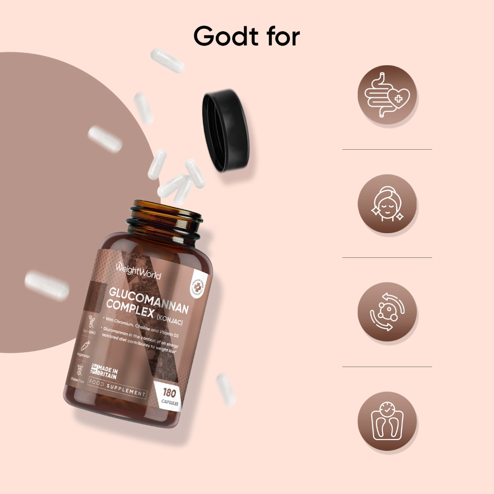 Glucomannan Complex med D3-vitamin, cholin og krom. Højt naturligt indhold af kostfibre, der stimulerer følelsen af mæthed.