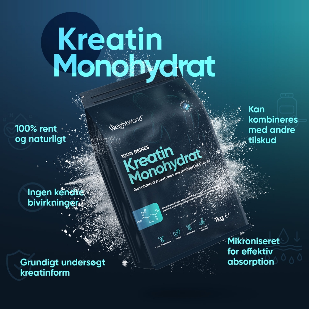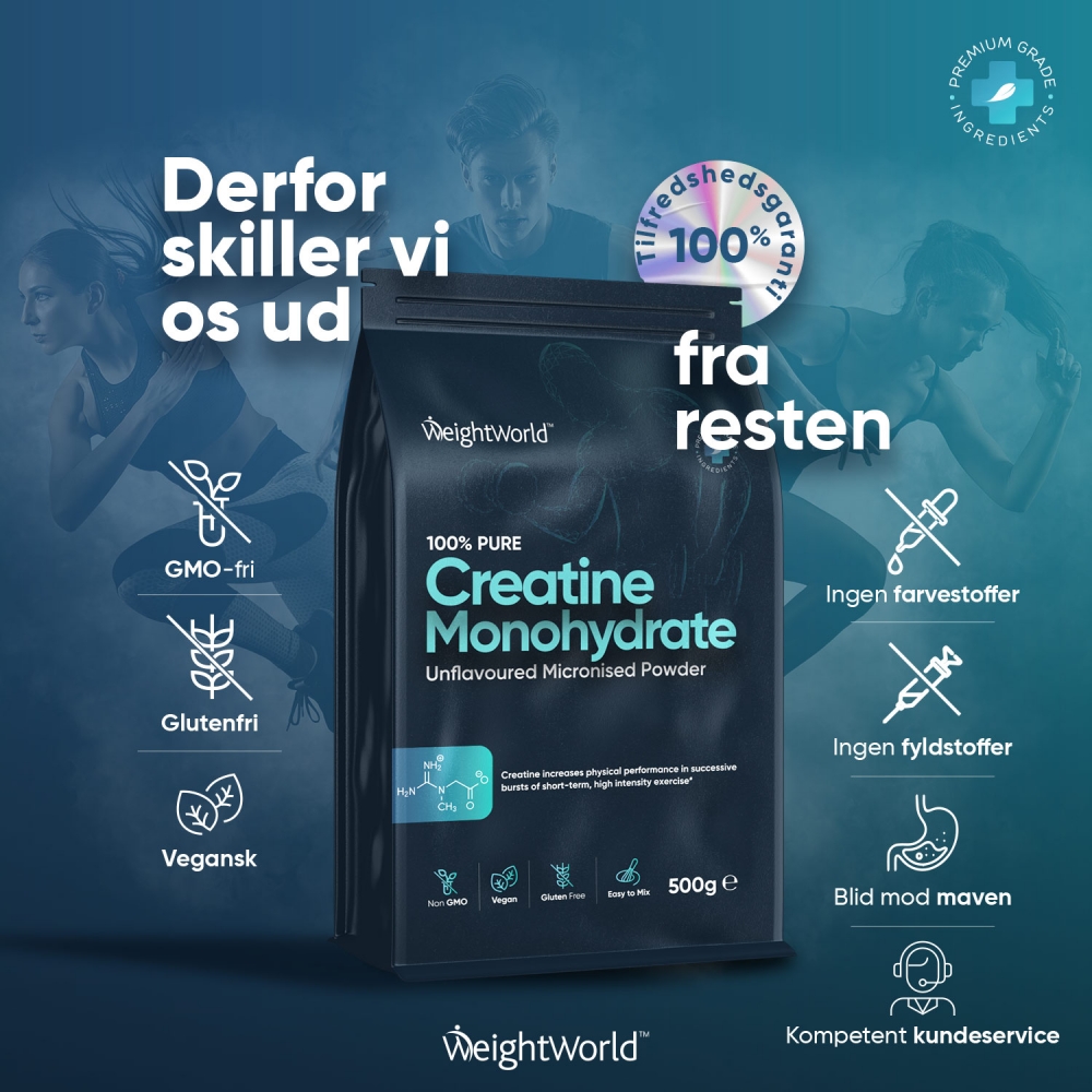 * Den gavnlige effekt opnås ved et dagligt indtag på mindst 3 gram (3000mg) kreatin, som er den anbefalede dagsdosis for vores kreatinpulver.