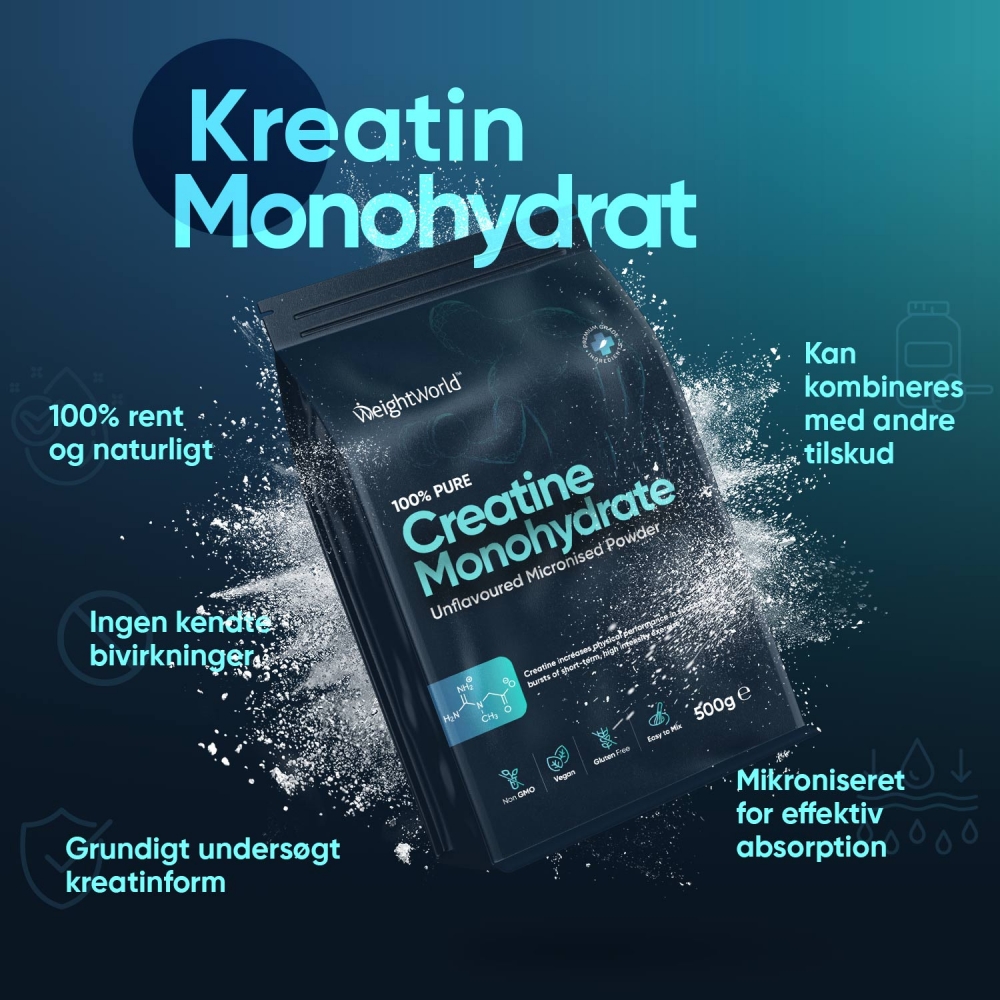 WeightWorld Kreatinpulver er et mikroniseret kreatintilskud i høj kvalitet, som er perfekt, hvis man dyrker styrketræning, crossfit eller anden form for kortvarig og intensiv træning.