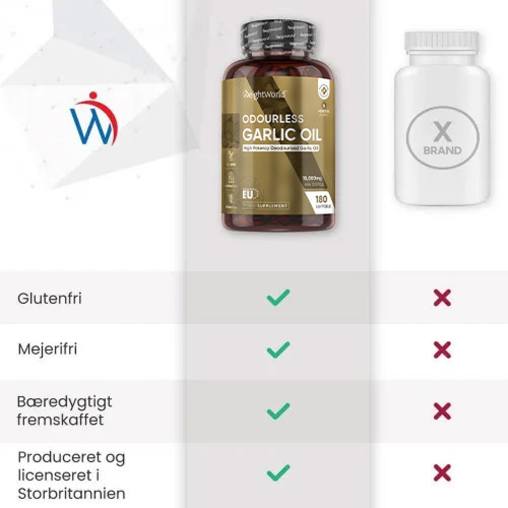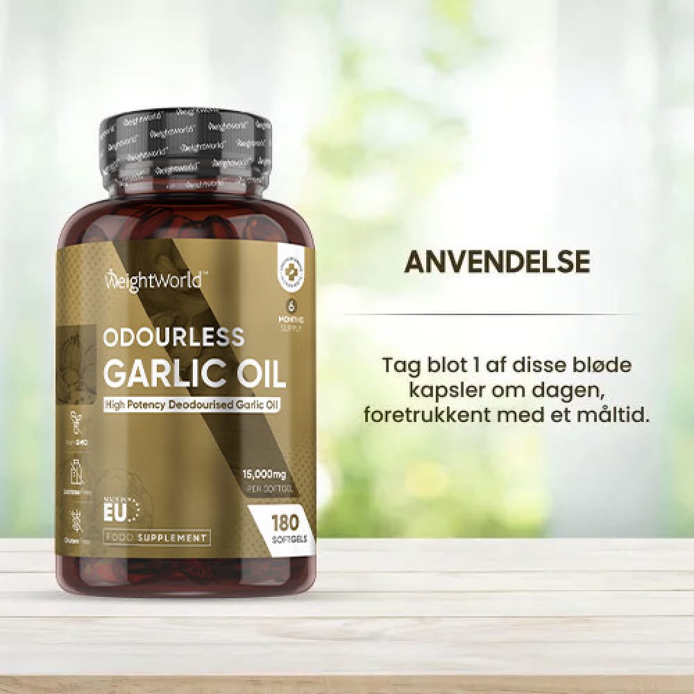 Netop derfor har vi hos WeightWorld valgt at lave vores 100% lugtfrie Hvidløgsolie-kapsler, så du kan nyde de mange fordele ved hvidløg, uden du skal bekymre dig om lugten.