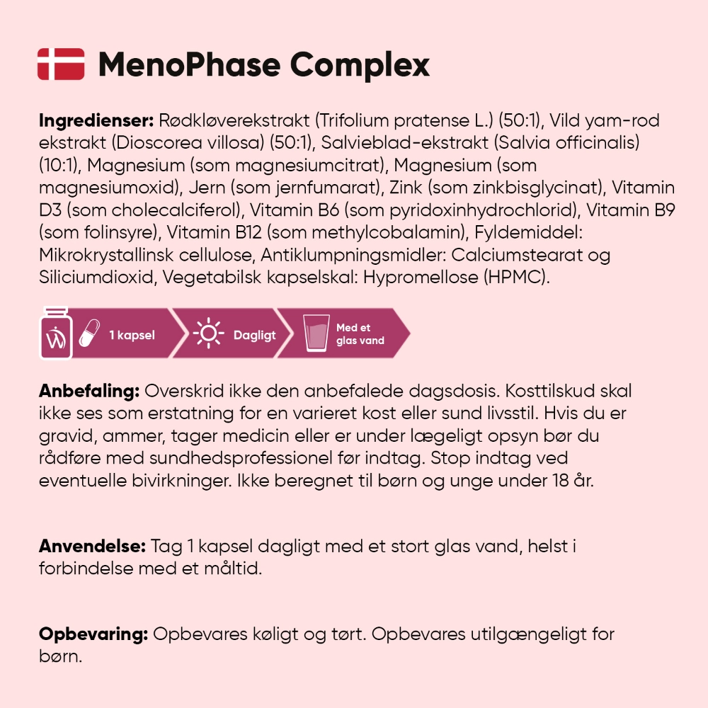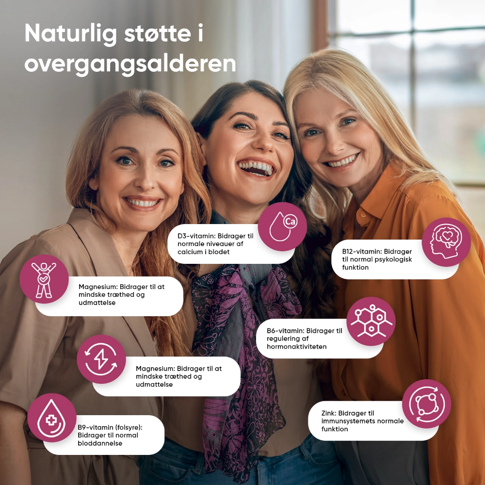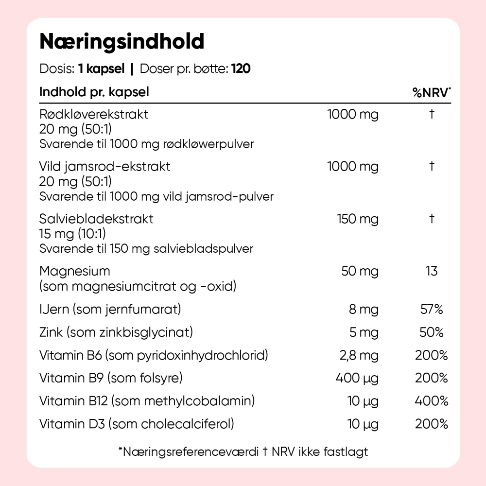 Vegansk kosttilskud til kvinder i overgangsalderen. Med rødkløver, wild yam, magnesium, jern, zink, D3-, B6-, B12-vitamin og folinsyre.
