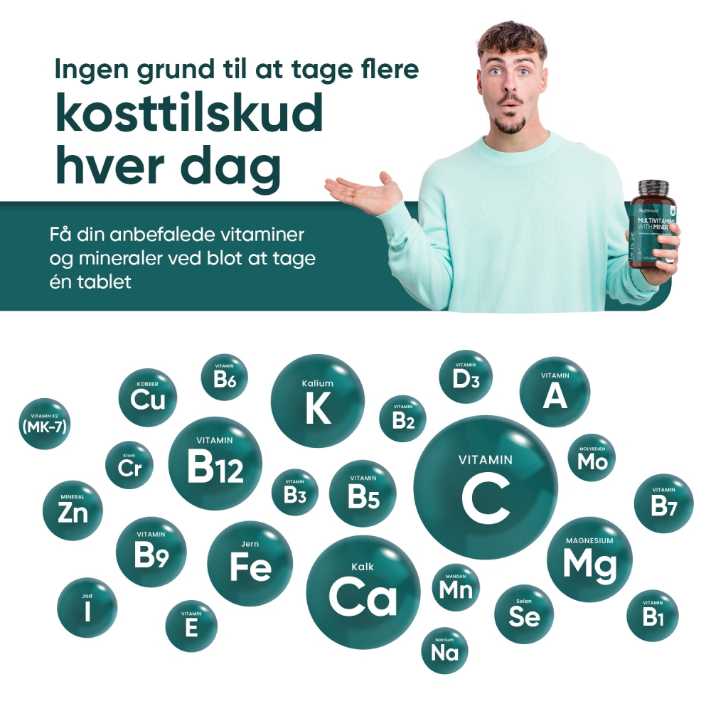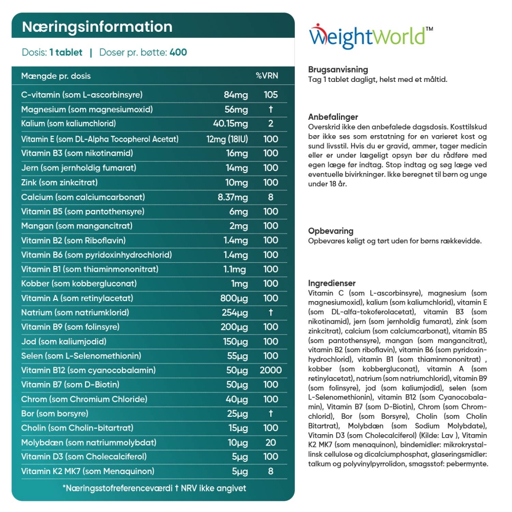 WeightWorlds Multivitamin og mineraler er et naturligt kosttilskud, som er beregnet til at blive taget dagligt for at give dig de bedste forudsætninger for at undgå vitamin- og mineralmangel.