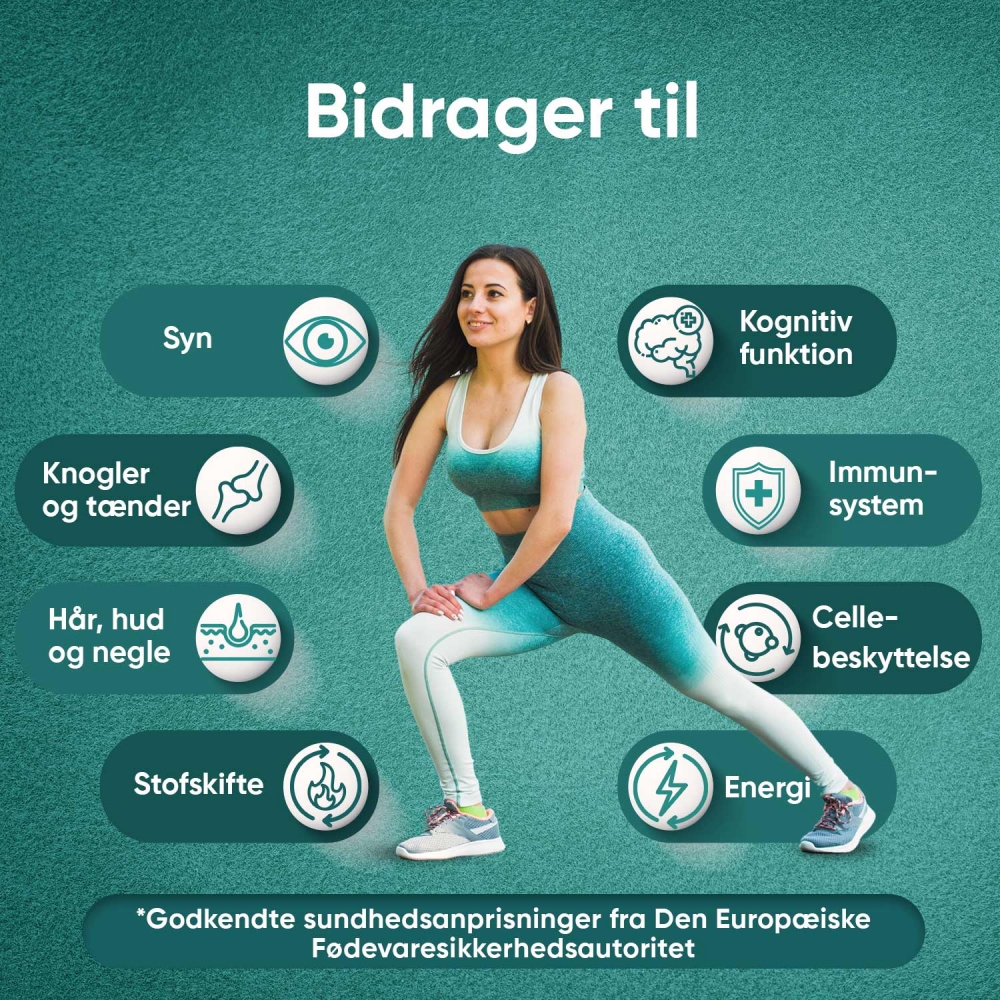Immunforsvaret: A-vitamin, C-vitamin, D-vitamin, B-vitaminer, jern, zink, kobber og selen bidrager til immunforsvarets normale funktion.