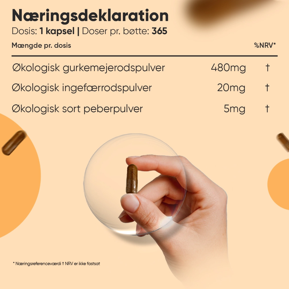 Gurkemeje-tilskud med ingefær og sort peber. 100% økologisk med dosis på 505 mg pr. kapsel, hvoraf 480 mg er gurkemeje.
