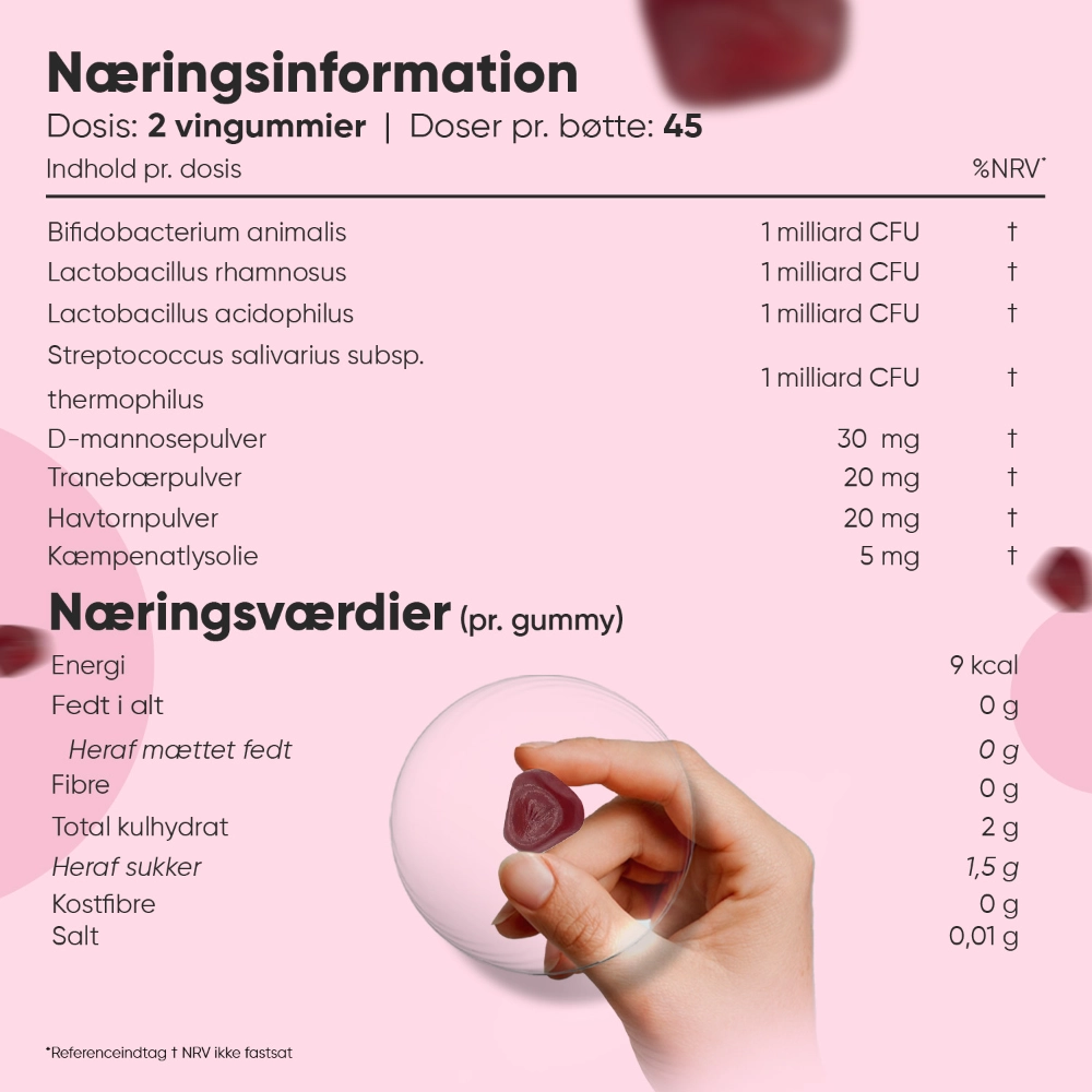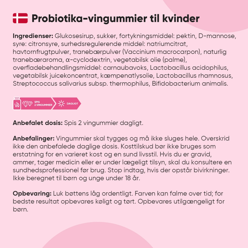 Veganske probiotika-vingummier til kvinder. 4 milliarder mavesunde bakterier pr. dosis. Beriget med havtorn, D-mannose, kæmpenatlysolie og tranebær.