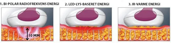 - Bi-Polar energien strammer huden effektivt indefra og ud. Apparatet når helt ned til 10 mm inde i huden og hjælper på at reducere appelsinhud.