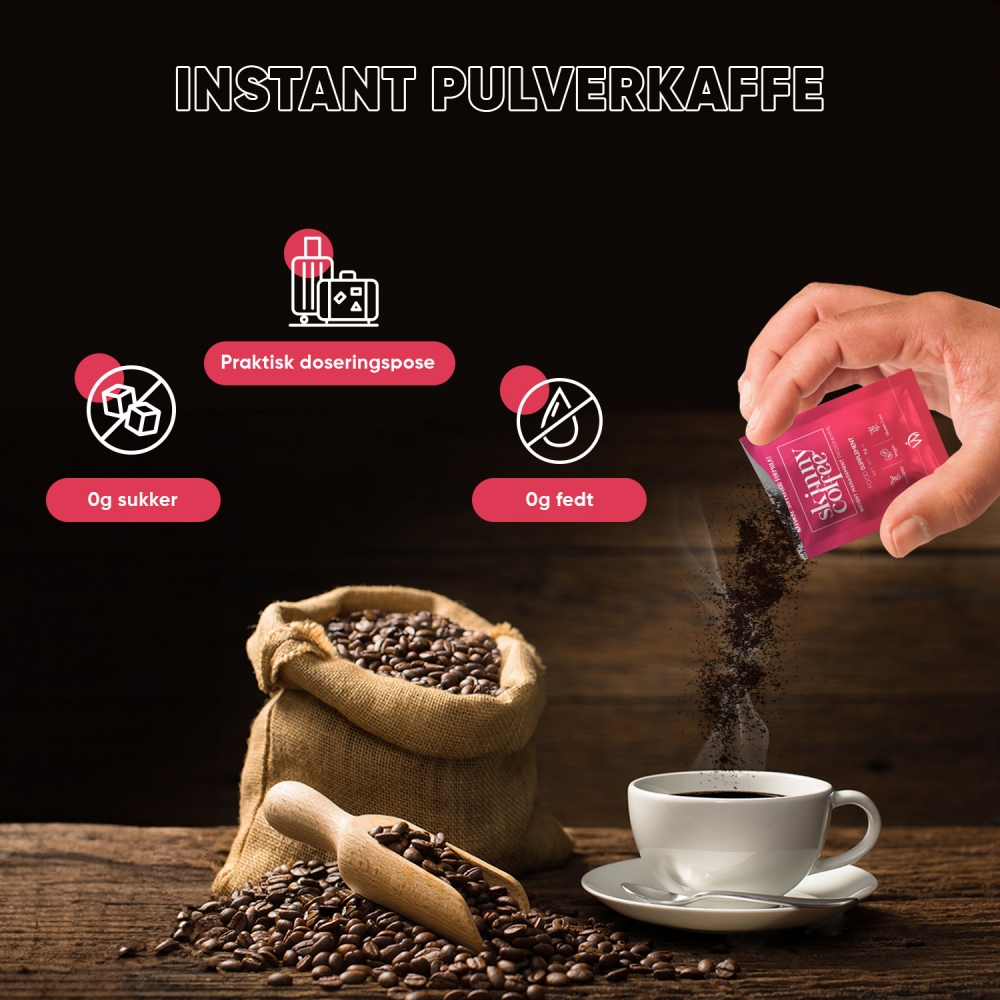 WeightWorlds slankekaffe er en pulverkaffe, der kombinerer arabicakaffe med 7 forskellige superfoods som guarana-pulver, L-carnitin og chlorella-pulver. Kaffens naturlige ingredienser gør den til et velsmagende alternativ til din almindelige morgenkaffe. Ligesom din almindelige kaffe indeholder vores slankekaffe koffein, og med vores 28-dages program får du optimal støtte i næsten en hel måned.