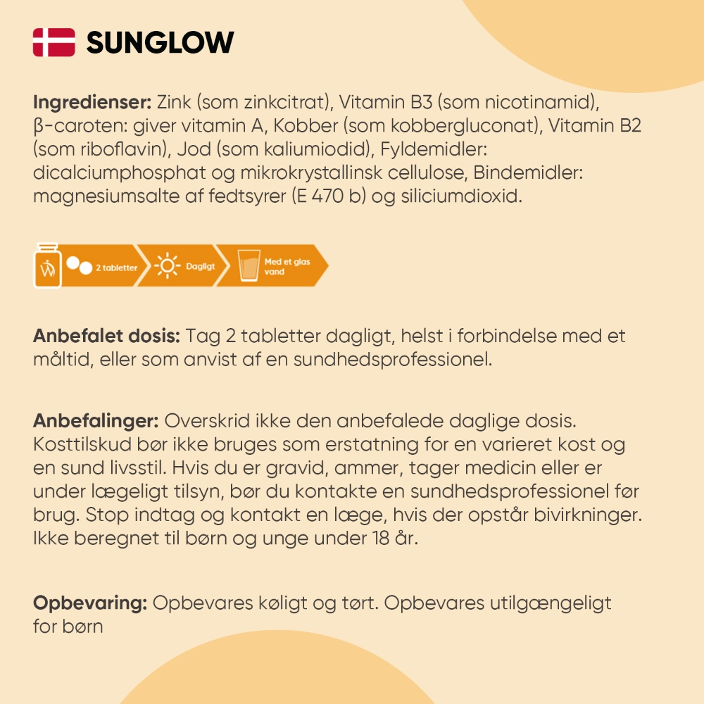 SunGlow-tabletter med betacaroten. Beriget med zink B3-vitamin, kobber, B2-vitamin og jod.