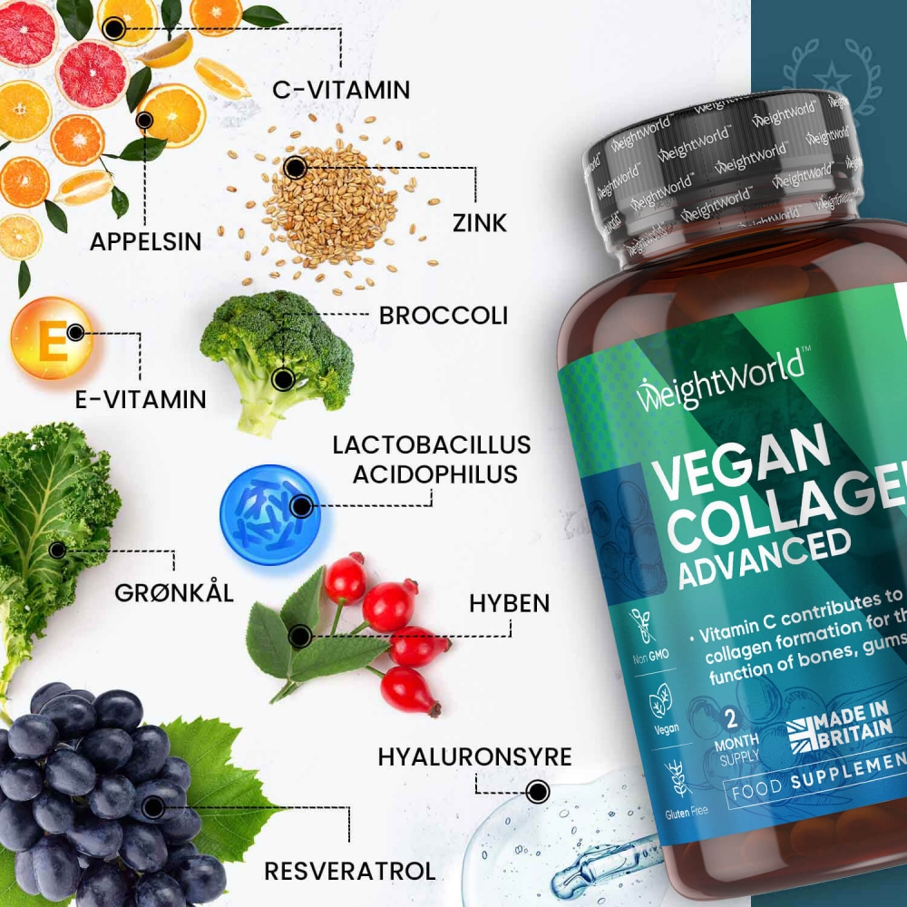 I modsætning til almindelige kollagen-tilskud til hud, knogler og led indeholder vores veganske kollagen-booster ingredienser som C-vitamin, resveratrol og zink, der bidrager til at vedligeholde et normalt niveau af kollagen i kroppen.