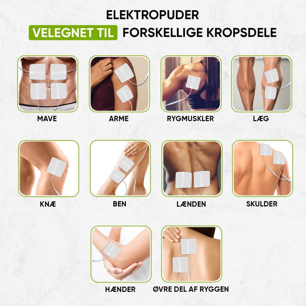 Der medfølger også elektroder, som giver ekstra fleksibilitet og kan bruges på skuldre, arme eller ryg, hvis du ønsker at stimulere blodcirkulationen eller lindre spændinger i disse områder.
